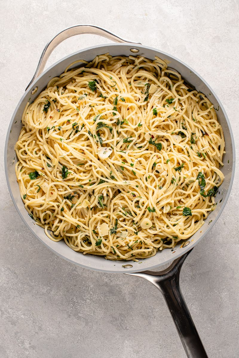 Pour the infused oil mixture over the cooked spaghetti and toss well to coat evenly.