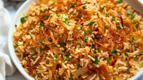 A savory, caramelized onion-flavored rice that elevates any main course.